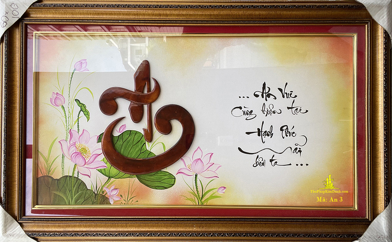 Các mẫu tranh thư pháp nổi bật của Khánh Vàng Đức Phát bao gồm: Tranh chữ An, với hình ảnh hoa sen được khéo léo kết hợp cùng câu thơ: “Gia quyến bình yên an lành/ Tiền bạc đến phước duyên thêm đầy”.